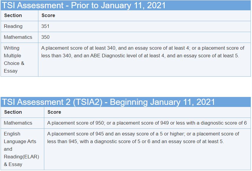 德克萨斯高等教育协调委员会(THECB)已经批准大学理事会提供的TSI评估作为入学学生唯一可接受的评估工具。 评估或评估结果不是入学条件,而是院校注册的条件。TSI豁免和豁免